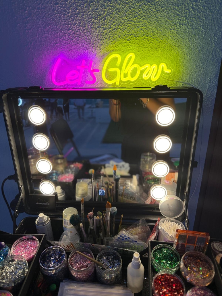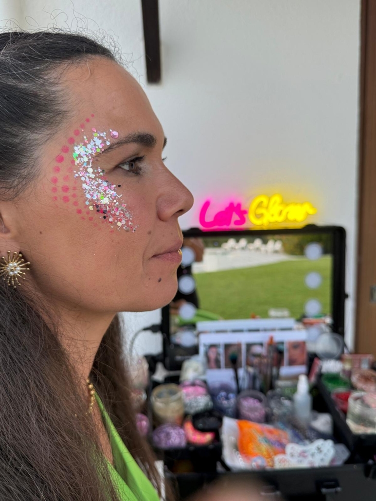Uma Makeup Glitter station é a aposta ideal para Festas, Eventos Corporativos, Casamentos e Ativações de Marca em Festivais. Dê mais cor ao seu evento, com a nossa maquilhagem cheia de brilho, incluindo vários tipos de brilhantes, cores neon e muito glitter.